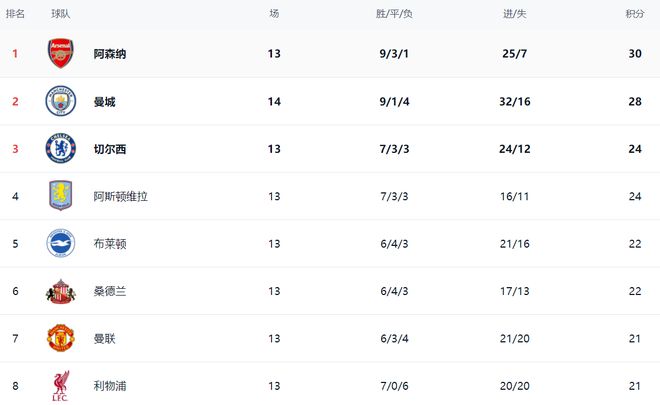 在积分榜上,阿森纳以30分排名榜首。曼城赢球之后,总积分达到28分,排名第2。曼城在多赛一场的情况下,只落后阿森纳2分,冠军的争夺变得越来越激烈。切尔西以24分排名第3。而阿斯顿维拉也是24分,排名第4。布莱顿和桑德兰都是22分,排名第5和第6。曼联21分排名第7。利物浦也是21分,排名第8。热刺是BIG6中最惨的,只拿到19分,排名第11。